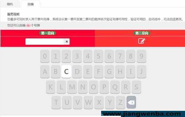 如果用户选择自编车牌号,则在交管12123软件进入自编选号操作页面。在自编选号操作页面中,号牌号码只允许通过界面中的虚拟键盘输入,针对号牌号码的每一位,会根据号池情况计算可用字符,只有可用的字符在虚拟键盘中才可以选择,其他均禁用不允许点击,不允许点击部分就是已被注册的。界面上会显示用户为当前车辆进行自编选号的剩余个数,最多可以同时输入的号牌号码数。