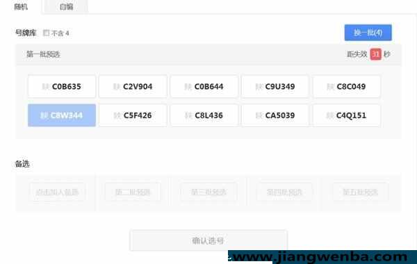 随即选号系统会为用户随机选出10个可选号牌号码,这时随机号牌栏会显示倒计时距失效XX秒, 同时,用户为当前车辆进行随机选号的剩余次数将减少1次,倒计时结束,随机号牌栏的号码将失效。可以根据剩余随即选号次数,多次选择。