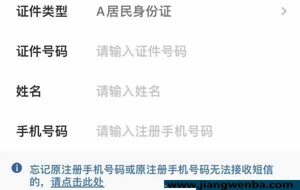 进入找回密码选项后会出现找回密码所需要填写的信息,分别是证件类型、证件号码、姓名和手机号码。需要指出的是中国公民选择证件类型通常选用居民身份证即可,但证件类型除有居民身份证选项外还有其它七种可选择;还需要指出的是填写的手机号码必须是注册手机号码,这里所指的注册手机号码不一定是账号注册之初的手机号码,该手机号码指的是当前账号绑定的手机号码。