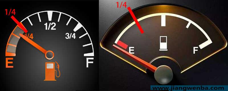 1、指针型油表:这种油表是指燃油数量需要通过指针的位置来确定油量,油表上的 E(Empty)和F(Full)两个字母分别代表不足和满油。油表的指针离字母F越近意味着油箱里余油越多,油表的指针离字母E越近则意味着油箱里余油越少。如果燃油图标亮起,就表明油箱里的余油已经不多,车辆需尽快加油。